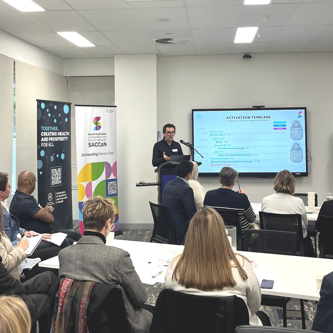On the 3 November, the CEIH and the South Australian Comprehensive Cancer Network (SACCaN) hosted a Cancer Clinical Trials Governance and Ethics workshop, bringing together more than 60 clinicians, researchers, trial coordinators, administrators and consumers with lived experience. Building on the priorities identified at the March 2025 SA Cancer Clinical Trials workshop, the session focused on strengthening our shared understanding of how governance and ethics processes currently operate across South Australia, where things feel unclear, and what opportunities could make the system easier to navigate. Participants explored how these processes operate day-to-day, where differences occur between services and how this affects trial start-up and collaboration. Through group discussions and activities, they identified the steps that feel unclear or inconsistent, and where greater statewide alignment could make a meaningful difference. These insights helped refine key priorities for strengthening clinical trials in South Australia. The workshop also highlighted how governance and ethics processes connect across the whole system. A consumer with lived experience, along with clinicians and trial staff, shred practical perspectives that helped shape a collective view of what a more connected and effective statewide approach could look like.